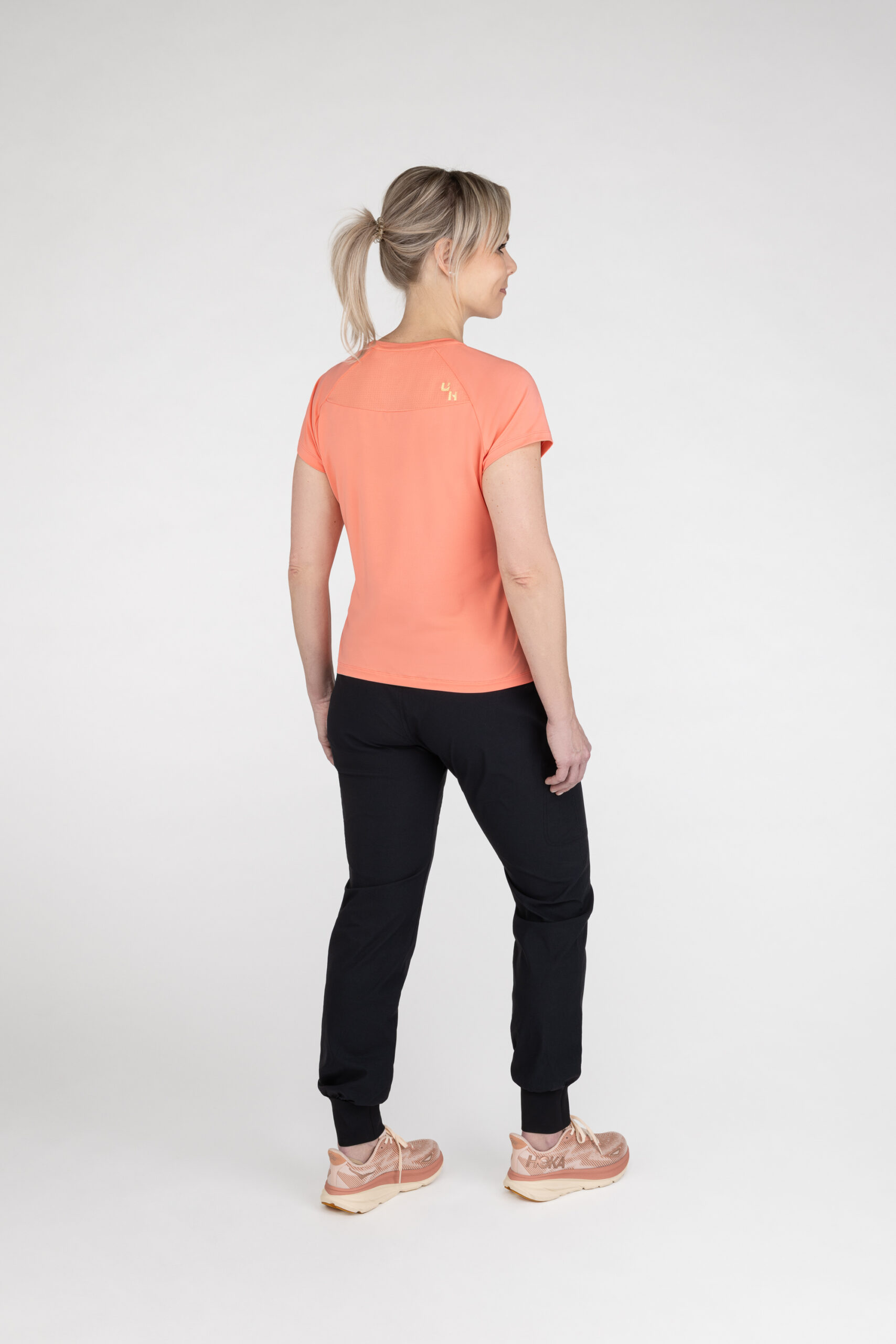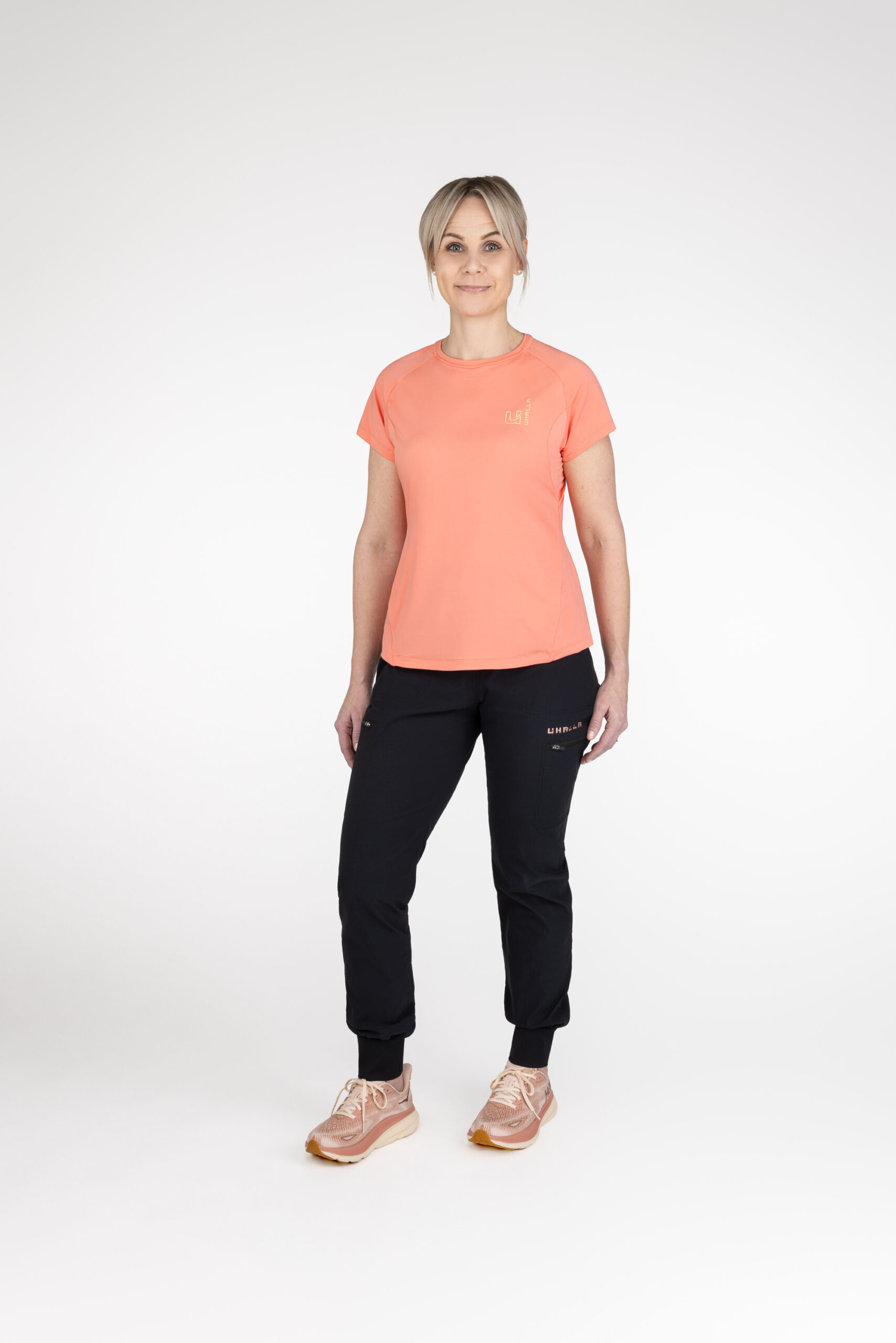 Kevyt, hengittävä ja kosteutta siirtävä naisten tekninen t-paita on ihanteellinen valinta niin sisä- kuin ulkotreeniin. Paidan valmistuksessa on käytetty kierrätettyä polyesteriä. Verkkokankaiset paneelit sivuissa ja takana lisäävät hengittävyyttä ja kosteudensiirtoa. Sporttinen leikkaus ja Uhalla-printit viimeistelevät tyylikkään ulkonäön.